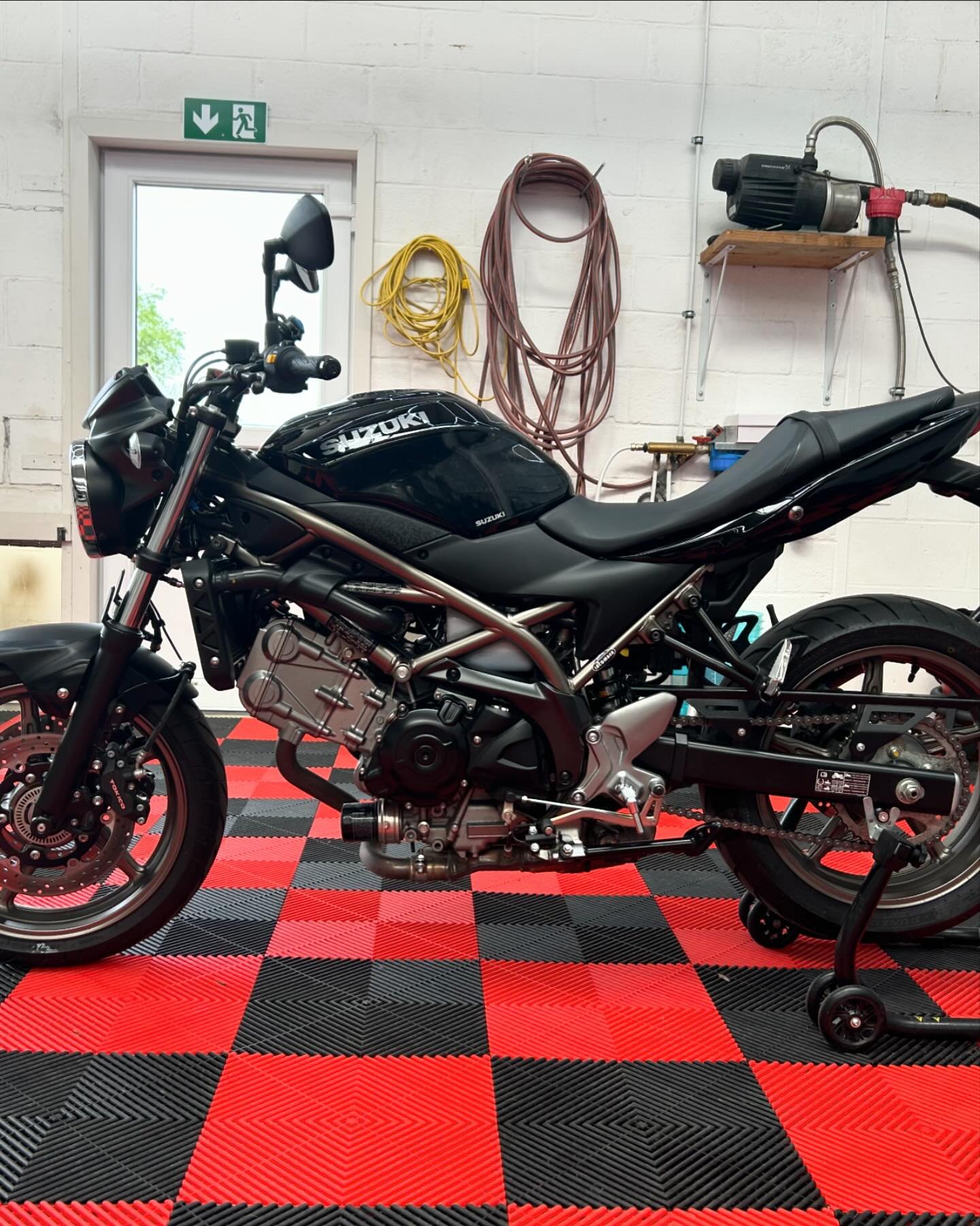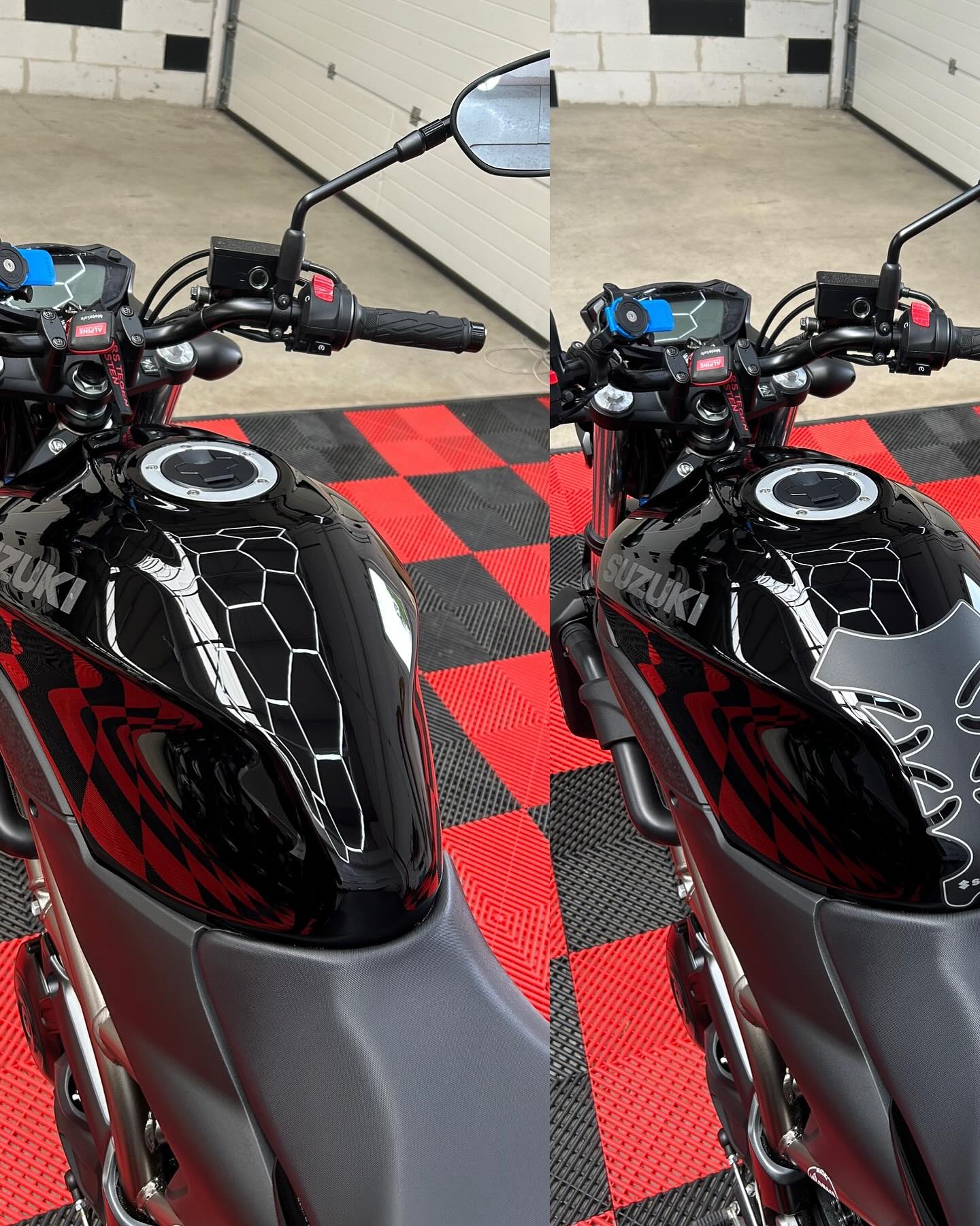 Deze moto werd voorzien van een polijstbehandeling waar mogelijk en lakcoating van de gelakte delen.